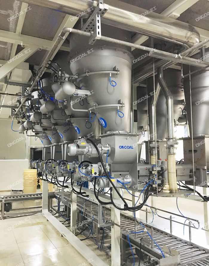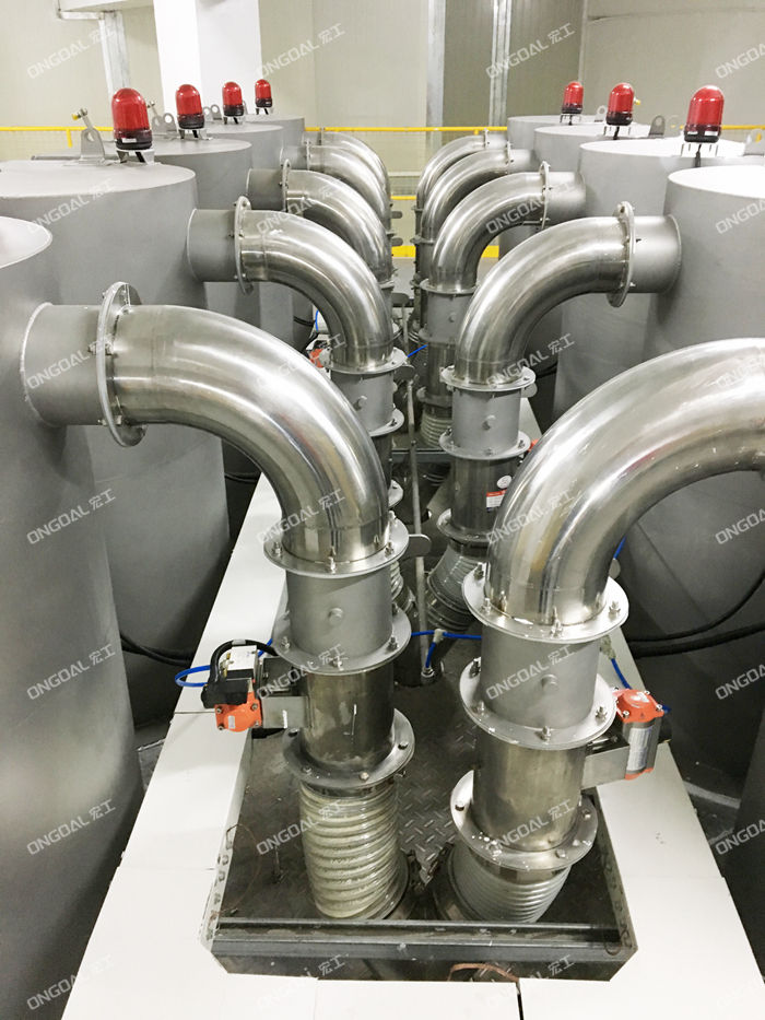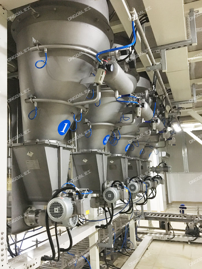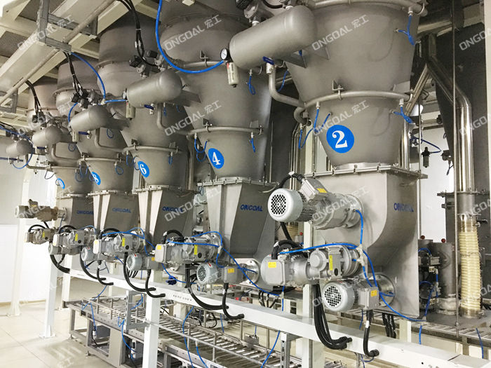 配料系統(tǒng)機(jī)組主要由多頭螺桿喂料機(jī)、破拱裝置、輸送線、投料倉、升降式計(jì)量稱、除塵裝置、鋼平臺、提升機(jī)、控制系統(tǒng)組成。