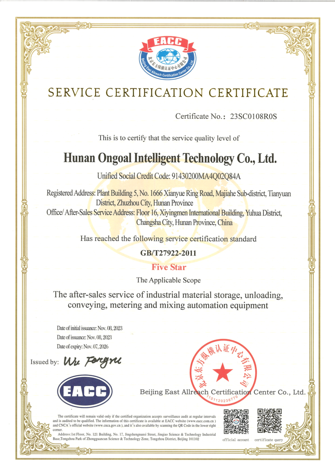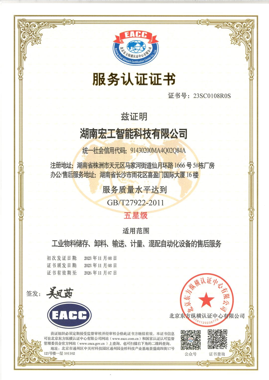 近日,宏工科技子公司湖南宏工智能科技有限公司售后服務通過質量服務五星級認證,標志著宏工科技的服務能力與品質得到行業(yè)和權威機構的高度認可。