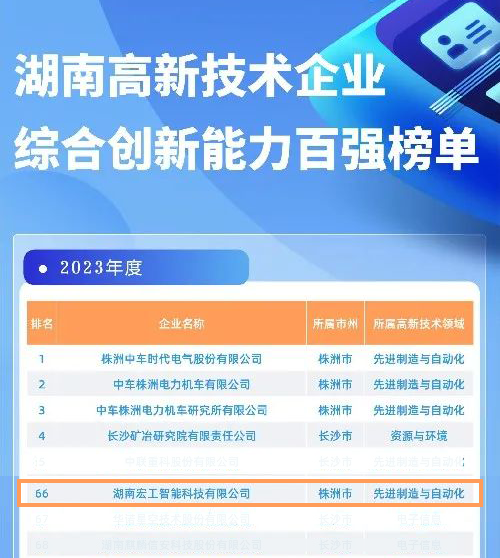 近日,“2023年度湖南省高新技術(shù)企業(yè)綜合創(chuàng)新能力百?gòu)?qiáng)榜單”,湖南宏工智能科技有限公司成功入選,標(biāo)志著宏工在自主創(chuàng)新能力、創(chuàng)新投入、社會(huì)貢獻(xiàn)等方面獲得認(rèn)可。